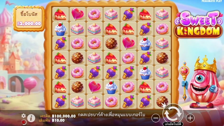 บรรยากาศภายในเกม Sweet Kingdom นั้นถูกออกแบบมาอย่างประณีต ราวกับเราหลุดเข้าไปในโลกแห่งเทพนิยายขนมหวาน รีลถูกวางบนฉากหลังที่เต็มไปด้วย ภูเขาน้ำตาลสายรุ้ง คัพเค้กสีพาสเทล และหมู่บ้านลูกกวาดที่แสนน่ารัก ทำให้ทุกครั้ง ที่หมุนวงล้อรู้สึกเหมือนกำลังเดินเล่นในแดนเวทมนตร์