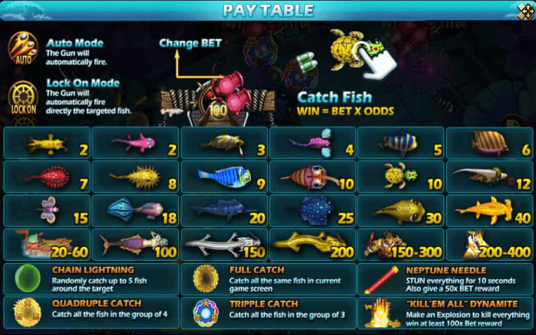 การจ่ายเงินรางวัลของการยิงปลา หากยิงปลาตัวเล็กตายจะได้เงินรางวัลเริ่มต้นที่ 2 บาท และหากยิงตัวใหญ่จะได้เงินรางวัลสูงสุดถึง 400 บาท ตามตัวอย่างภาพด้านบน หากเดิมพันสูงก็จะยิ่งได้เงินรางวัลตอบแทนที่มากขึ้น เล็งเป้าหมายแล้วใช้โหมด slotxo auto เพื่อยิงอัตโนมัติ เกมยิงปลาออนไลน์เล่นง่ายเล่นเพลิน เซียนพนันห้ามพลาดเด็ดขาดกับผลงานเกมส์สุดฮิต ได้เงินจริง เพียงสมัครสมาชิกวันนี้ รับทันที slotxo ฟรีเครดิต 50 ล่าสุด