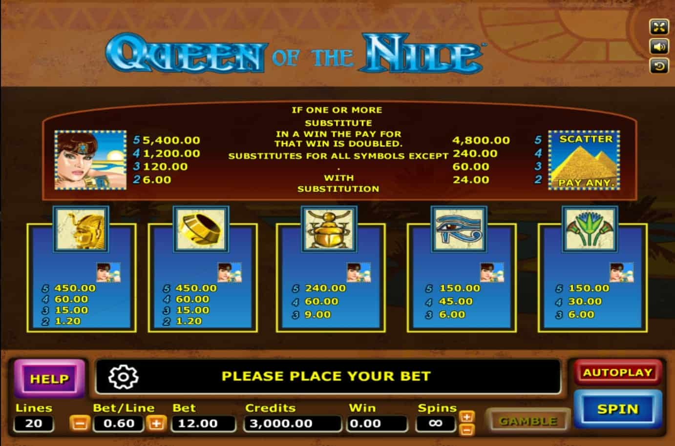 ตัวอย่าง Symbols และ Lines ของเกม Queen Of The Nile จาก XOSLOT