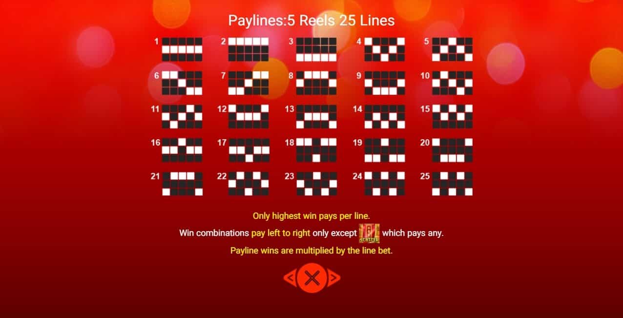 ผู้เล่นจะได้เล่นบน 5 รีลพร้อม 25 ช่องจ่ายเงินที่เป็นไปได้ สัญลักษณ์ทั้งหมดขึ้นอยู่กับรอบหมุนสปินของผู้เล่นว่าจะได้การรวบรวมสัญลักษณ์ได้มากเท่าไหร่ภายในแถวของเพยืไลน์ ยิ่งเกมใดที่มีเพย์ไลน์มากเท่าไหร่ก็จะยิ่งมีโอกาสที่ชนะมากขึ้นเท่านั้น แต่เงินรางวัลของคุณจะเพิ่มขึ้นแน่นอน
